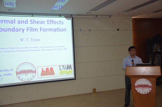 9月27日下午,Tysoe教授就该课题组关于摩擦学领域的最新研究成果为全校师生做了专场学术报告,摩擦学研究所所长刘焜教授主持报告会,海洋之神线路网址院长訾斌教授致开幕辞,代表全体师生欢迎Tysoe教授来我院讲学与学术交流。Tysoe教授报告主题是“固-固滑动界面的原位化学反应过程和动力学模型”(In-situ Modeling of Reaction Pathways and Kinetics at a Sliding Solid-Solid Interface),报告主要从微观角度探讨了在滑动过程中固体摩擦表面边界膜的形成过程,通过超真空摩擦实验和多种原位检测手段,多角度分析还原了摩擦过程中的分子尺度上的化学反应过程,以此建立了分子动力学反应模型,并验证了相关的摩擦化学反应机理。持续一个多小时的报告深入浅出的介绍了原位检测技术在微观摩擦学上的应用,巧妙的实验安排和缜密的逻辑分析让广大师生耳目一新,收获良多,最后广大师生和Tysoe教授就报告内容进行了的讨论。