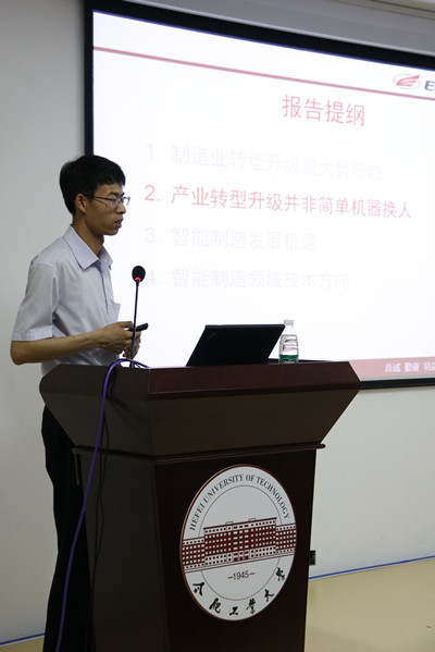 报告邀请了埃夫特智能装备股份有限公司副总工程师肖永强博士做主讲。报告中,肖博士从智能制造转型升级趋势、产业转型升级、智能制造发展机遇和智能制造领域技术方向四个方面向同学们展开解读。同时介绍了机器人行业的前景,讲述了现有机器人行业技术发展情况、企业情况,以及人工智能技术发展对机器人行业的影响。通过对柔性生产线、机械手和人工智能的讲解,提升学生在创新方面的认识,最后做出了关于大学生工作生活以及就业经验的分享。报告结束后,肖博士对机械学院的同学们发出了邀请,表示欢迎大家到埃夫特公司参观学习。该院2016级学生石柯听完报告后说:“这个报告对我而言很受启发,平时对这方面了解不系统,这次心中的疑惑得以解答。”
